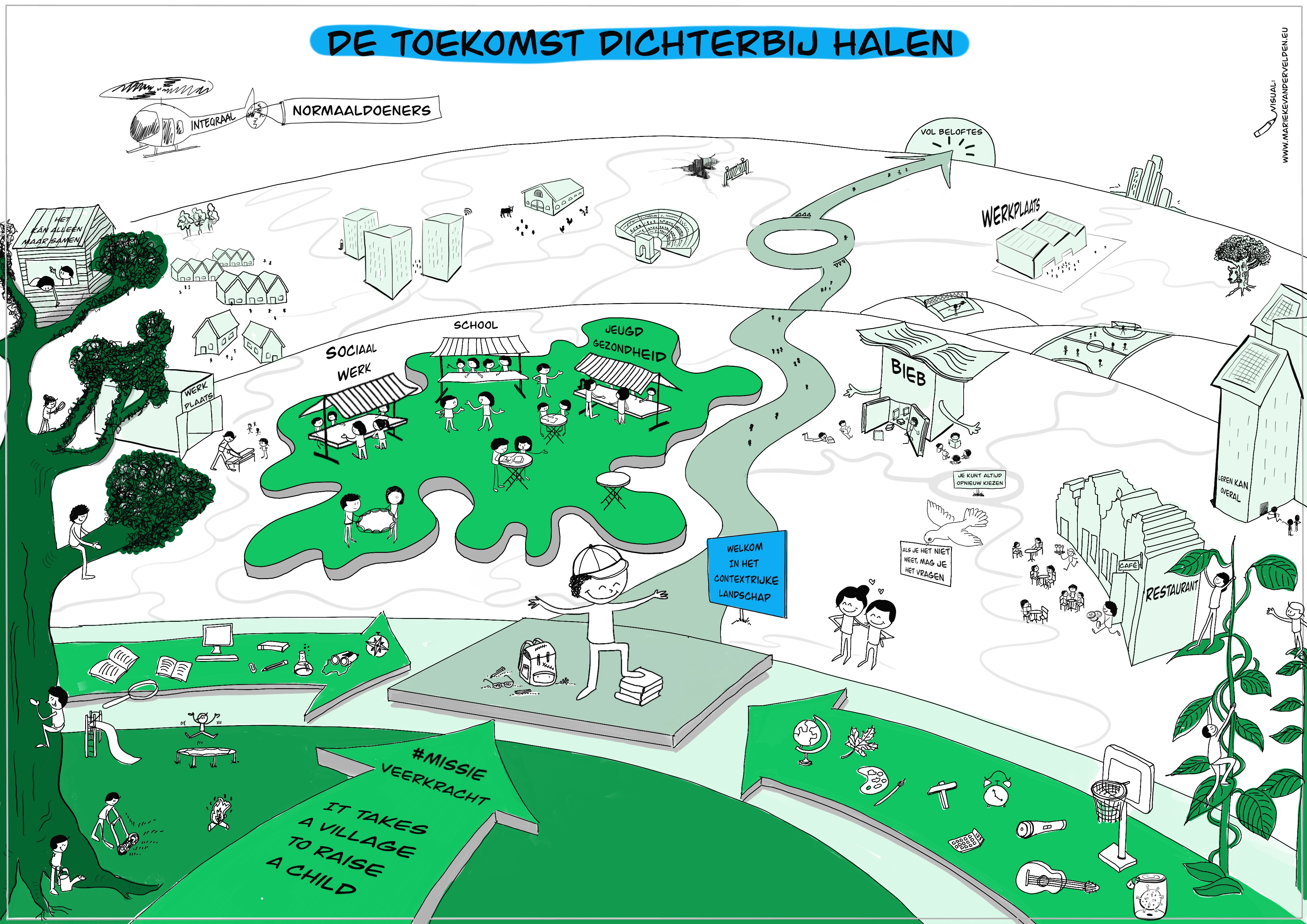 De kerngedachte is de titel van de tekening: de toekomst dichterbij halen. We willen als samenwerkende partijen rond jeugdigen graag dat de toekomst met onze inzet dichterbij komt. Daarvoor is het nodig om aan te sluiten bij wat jeugdigen zoal tegenkomen en dat is veel meer dan alleen de school of de andere instituten. Juist die samenhang met het contextrijke landschap is noodzakelijk voor het gezond, veilig en kansrijk opgroeien.